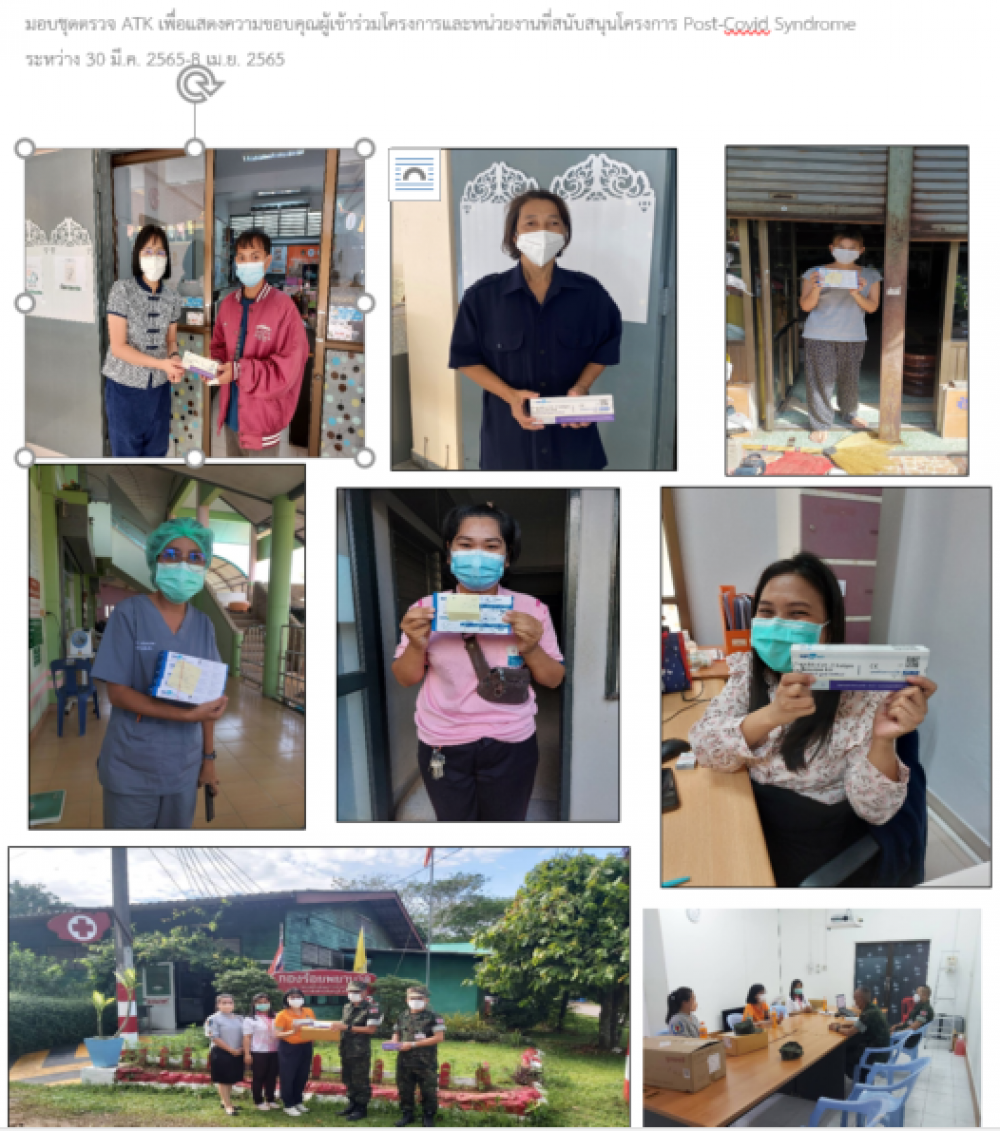 - กิจกรรมประเมินภาวะสุขภาพ ก่อนและหลังเข้าโครงการ ได้แก่ การตรวจสมรรถภาพปอดด้วยการทดสอบการเดิน 6 นาที (6MWT) หรือ ลุกนั่ง 6 นาที (STST), วัดค่า BMI, และตอบแบบสอบถามวัดคุณภาพชีวิต (WHOQOL-BREF-THAI) (รูปแบบปกติ และ/หรือออนไลน์)