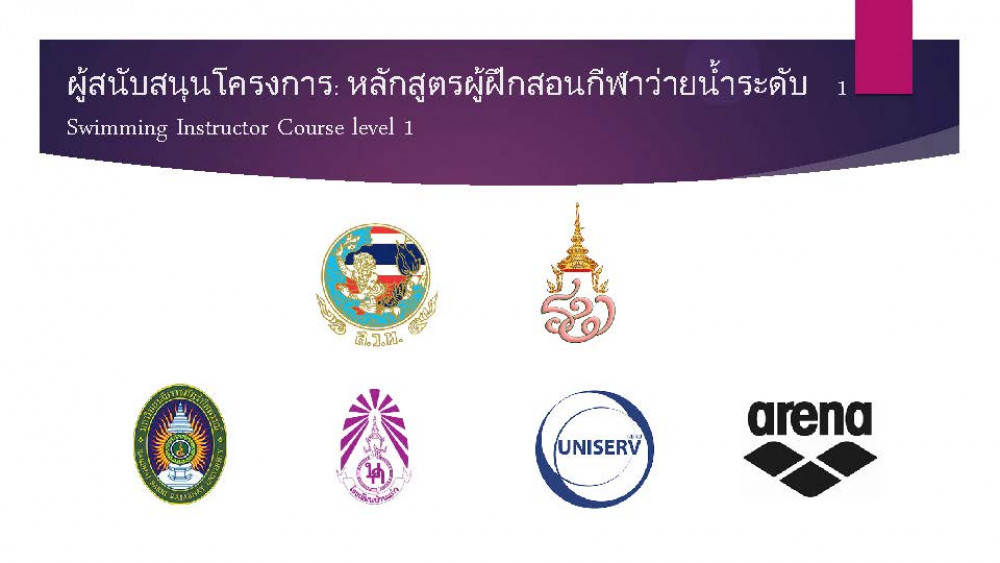 หลักสูตรประกาศนียบัตรครูสอนว่ายน้ำระดับพื้นฐานเป็นหลักสูตรที่ทางสมาคมกีฬาว่ายน้ำแห่งประเทศไทยจัดทำขึ้นเพื่อให้บุคลากรทางการกีฬา ว่ายน้ำ ผู้ฝึกสอน ครูพลศึกษา ได้รับการอบรมวิธีการสอนว่ายน้ำเพื่อให้มีทักษะว่ายน้ำขั้นพื้นฐาน ที่ถูกต้องสามารถช่วยเหลือตัวเองในน้ำได้ ซึ่งการอบรมระดับ 1เป็นหลักสูตรที่สามารถขึ้นทะเบียนผู้ฝึกสอนกีฬาของสมาคมกีฬาว่ายน้ำแห่งประเทศไทยและขึ้นทะเบียนผู้ฝึกสอนของการกีฬาแห่งประเทศไทยได้
